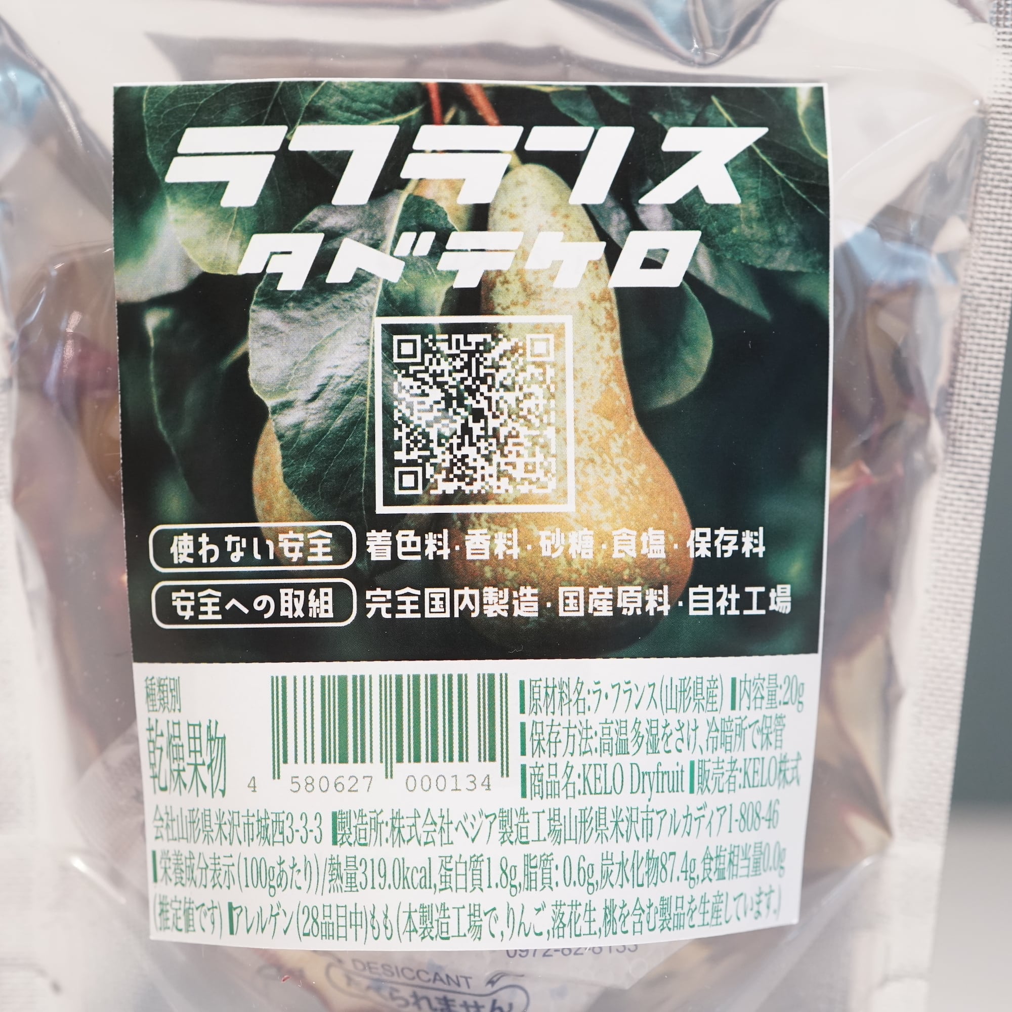 山形県産のラ・フランスを使用し、国内で丁寧に製造されています。化学調味料は一切使用せず、独自の「常温除湿乾燥」技術により、栄養素と芳醇な香りをそのまま閉じ込めています。ラ・フランス特有の上品でみずみずしい甘さが、噛むたびに広がり、フルーティーな味わいを楽しめます。